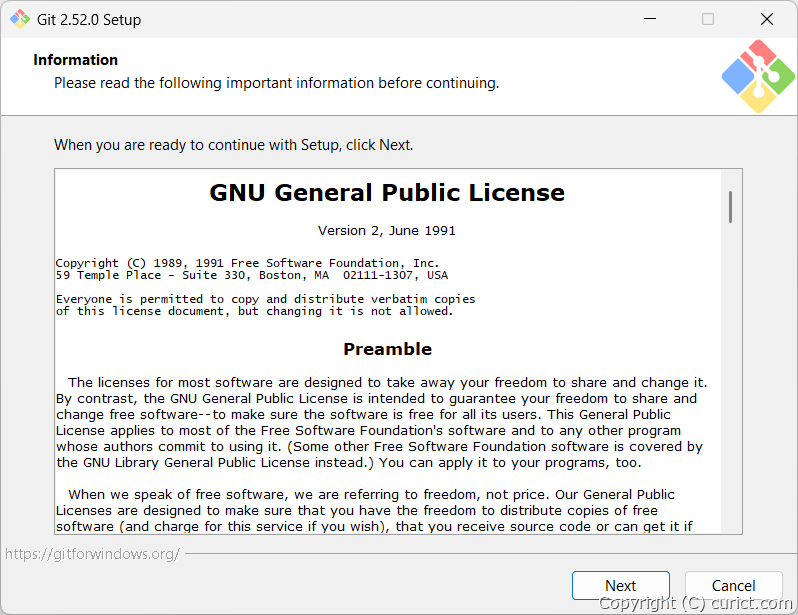 Git for Windowsは無料で使用できますが、GNUライセンスへの同意が必要です。問題なければ[Next]ボタンを押します。