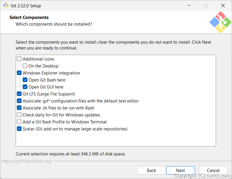 Scalar がインストールされます。Scalarは大規模リポジトリでGit操作が快適に動作するようにサポートするツールです。リポジトリ設定の最適化、部分クローンによる容量削減、高速化などを行います。既存リポジトリに適用するには scalar registerコマンド、新しくCloneから開始するには scalar cloneコマンドを使用します。詳細は公式サイトを参照してください。