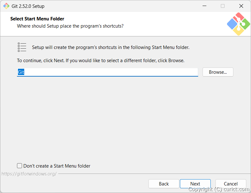 スタートメニューへの追加先を選択します。スタートメニューに追加しない場合は「Don't create a Start Menu folder」にチェックを入れます。