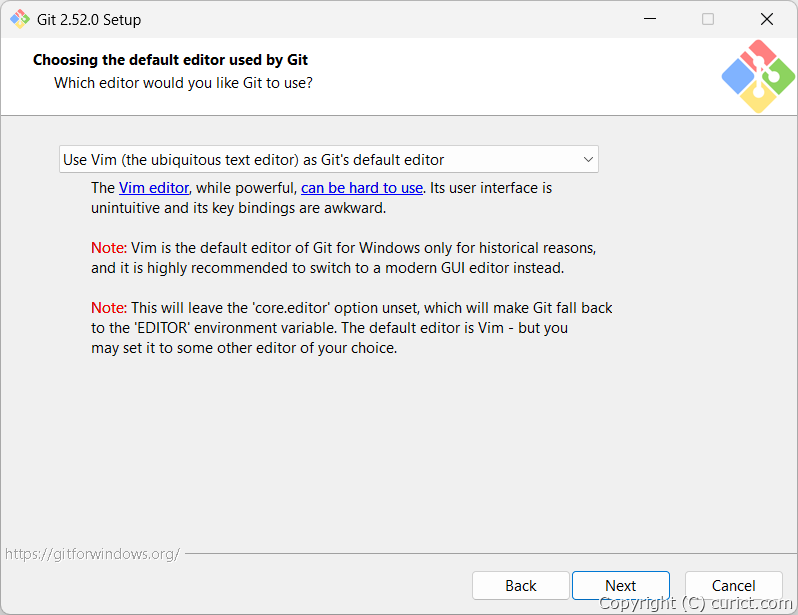 コミットメッセージ等の入力に使用する、テキストエディターを選択します。Git Bash や コマンドプロンプト、PowerShell などでメッセージ入力が必要なGitコマンドを実行すると、選択したエディターが起動します。