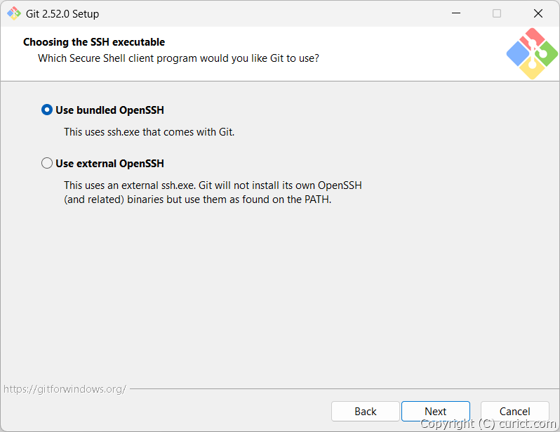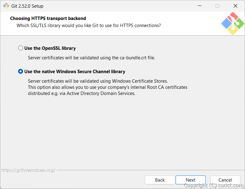 GitがHTTPSでリモートリポジトリに接続する際の設定です。通常は[Use the OpenSSL library]を選択します。