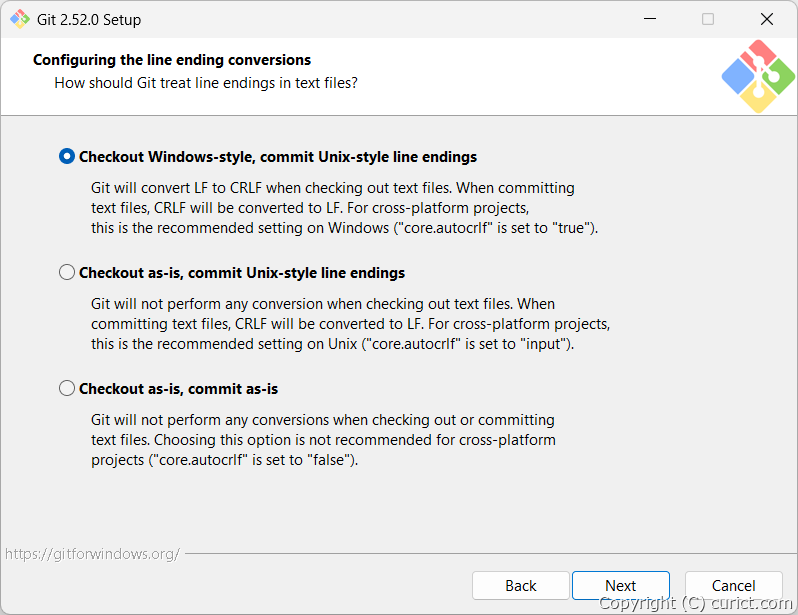 改行コードがチェックアウト時に「CR-LF」(Windowsで使われるキャリッジリターンとラインフィードの組み合わせ)、コミット時に「LF」(Unix系OSで使われるラインフィードのみ)に自動変換されます。 -