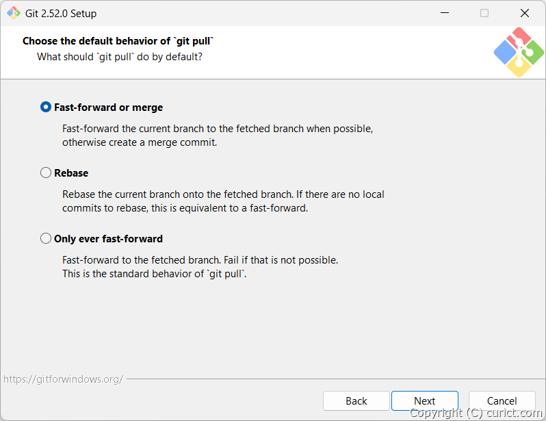 コマンド「git pull」 でマージを行う際の挙動を選択します。通常は「Fast-forward or merge」を選択します。