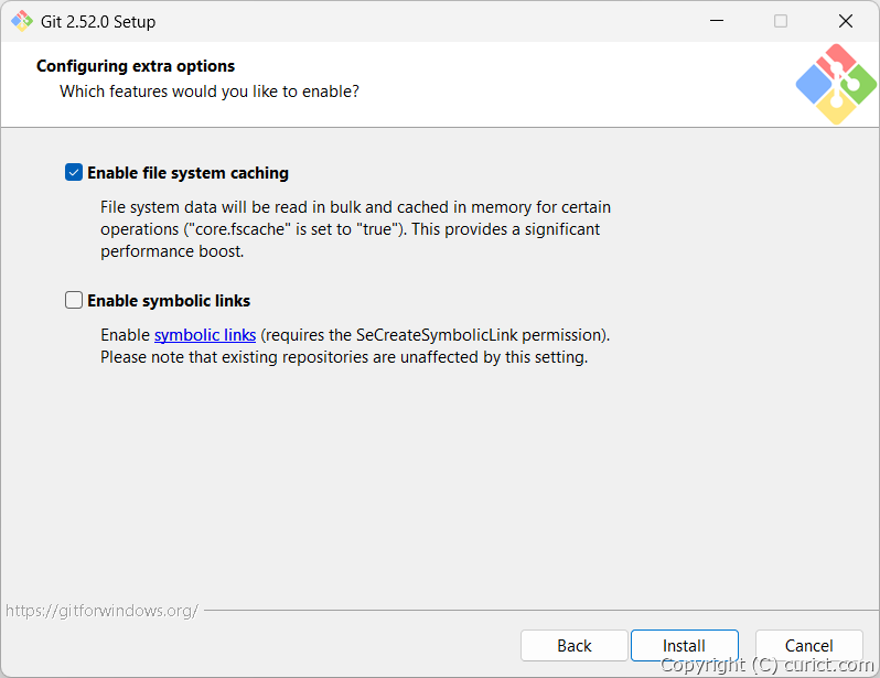 リポジトリ内でシンボリックリンクを使用したい場合にチェックします。 Windowsのシンボリックリンクは Linux系OSと互換性がありません。そのため、Windows版Gitではシンボリックリンクの代わりに、リンク先を記されたテキストファイルが作成されます。チェックをオンにするとテキストファイルではなく、シンボリックリンクが作成されます。