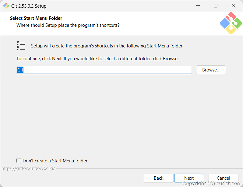 スタートメニューへの追加先を選択します。スタートメニューに追加しない場合は「Don't create a Start Menu folder」にチェックを入れます。