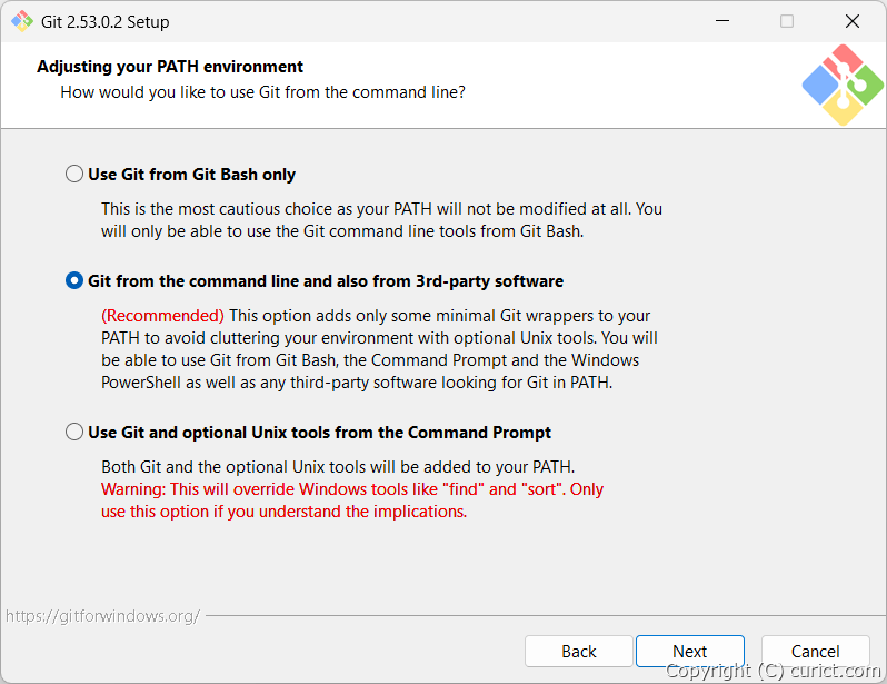 DOSプロンプト や PowerShell で Unix のコマンドが使えるようになります。"find "や "sort" など、名前が同じで動作が異なるコマンドがあるため、熟知されている方以外にはお勧めできません。PATH に次のフォルダが追加されます。- <Gitインストール先>\Git\cmd