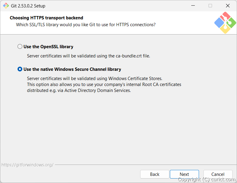 HTTPS接続の検証にWindows証明書ストアのルート証明書を使用します。 Active Directory で管理されている Windowsサーバーや TFSサーバー上の git リポジトリ に接続する場合、こちらを選択しないと接続できない場合があります。