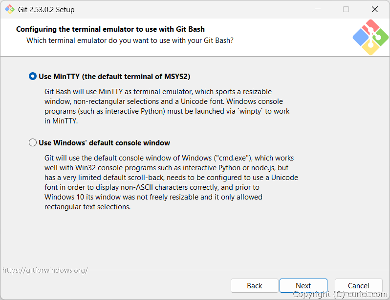Git Bashで使用するターミナルを選択します。わからなければ「Use MinTTY」を選択します。
