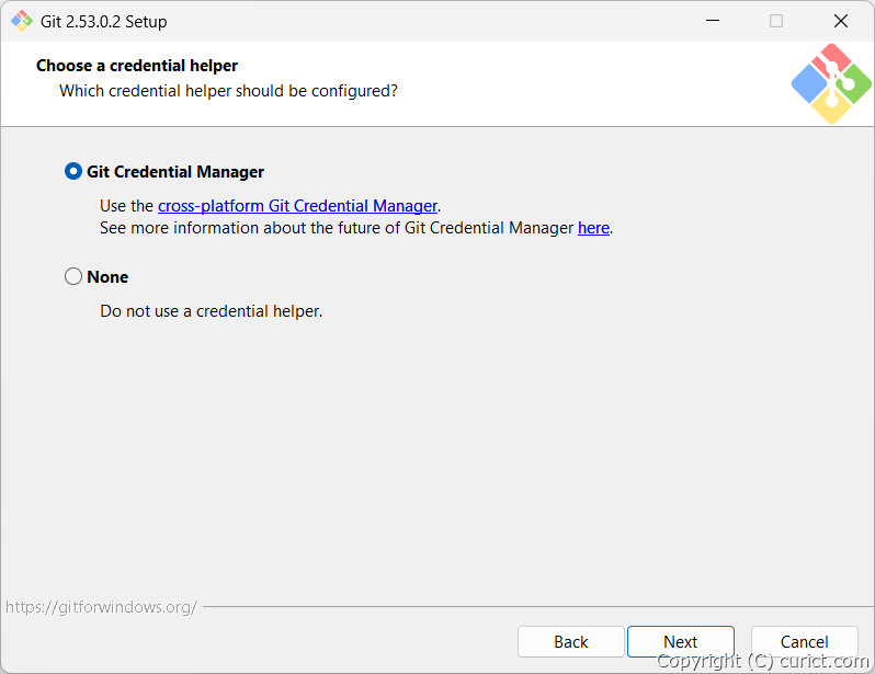 インストールすると、リモートリポジトリに接続する際に毎回認証する手間が省けます。通常は「Git Credential Manager」を選択します。